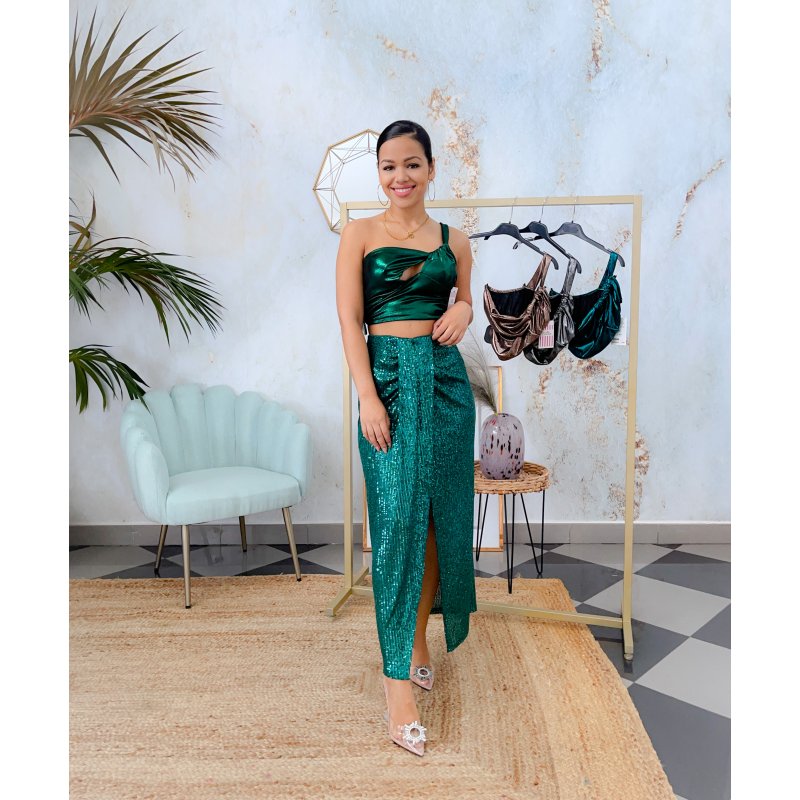 La modelo lleva color: verde botella